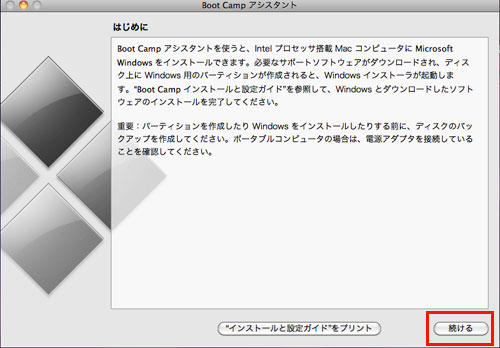 2.BootCampアシスタントの画面になったら続けるをクリック